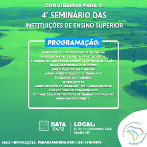 O evento será realizado no dia 04 de dezembro, em Marília/SP O Seminário das Instituições de Ensino Superior (IES) é promovido pelo Comitê da Bacia